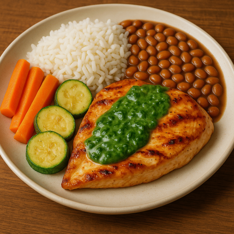 FRANGO GRELHADO AO MOLHO DE ESPINAFRE + ARROZ + FEIJÃO + ABOBRINHA PORTUGUESA + CENOURA EM RODELAS