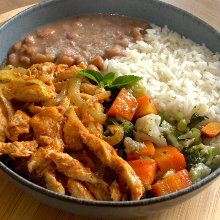 ISCAS DE FRANGO ACEBOLADO + ARROZ + FEIJÃO + MIX DE LEGUMES