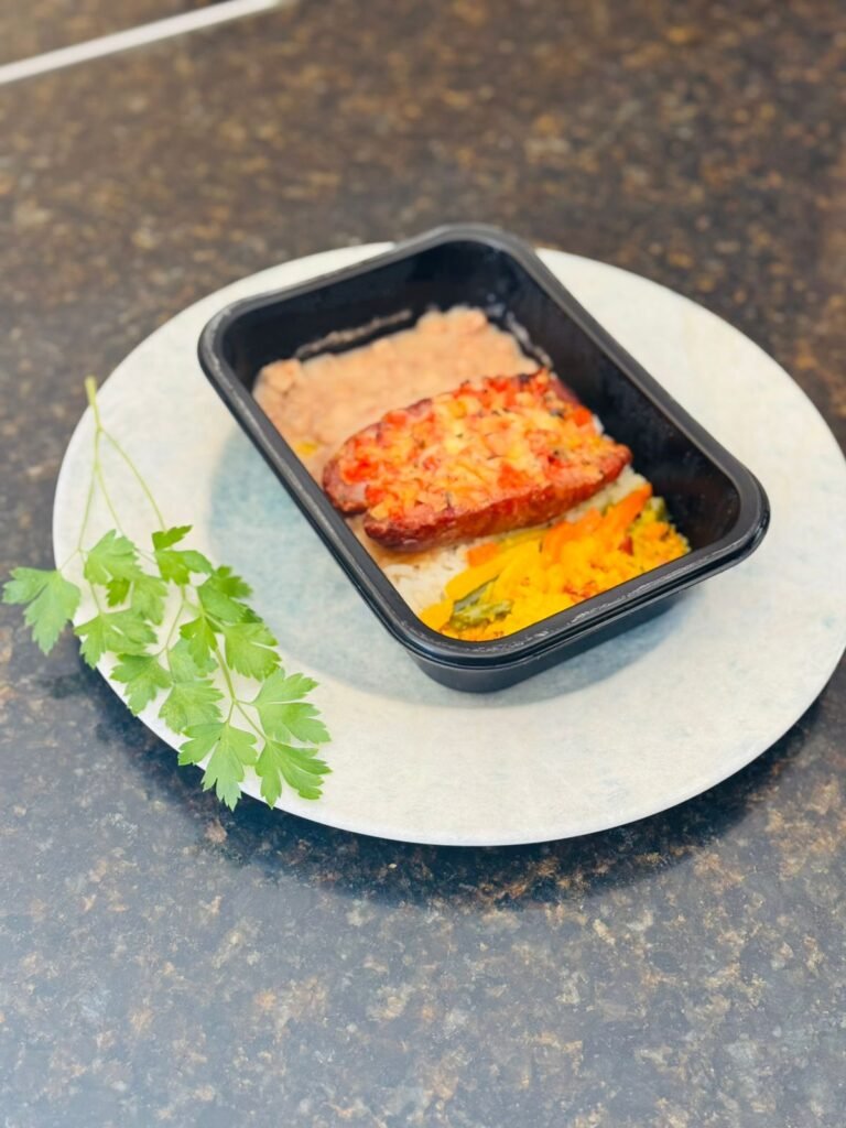 LINGUIÇA RECHEADA + ARROZ + FEIJÃO + FAROFA + MIX DE LEGUMES