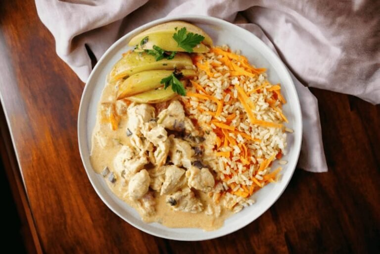 STROGONOFF DE FRANGO + ARROZ + BATATA RÚSTICA + CENOURA PALITO